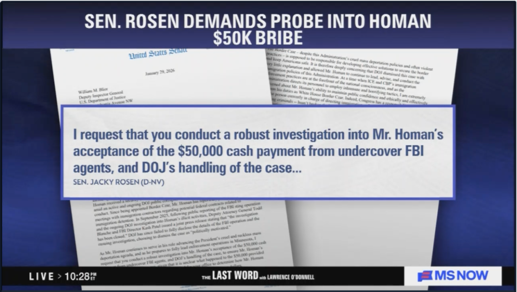 Lawrence O’Donnell: “The man who says he is now in charge of drawing down Donald Trump’s invasion of Minneapolis was recorded by FBI undercover agents on video receiving $50,000 in a cash payoff during the last Trump presidential campaign. Democratic Senator Jacky Rosen of Nevada is now demanding that the Trump Justice Department Inspector General investigate the $50,000 undercover payoff to Donald Trump’s so-called Border Czar, Tom Homan, who says he did nothing wrong. In a letter to the Deputy Inspector General of the Trump Justice Department, Senator Rosen says, ‘I request that you conduct a robust investigation into Mr. Homan’s acceptance of the $50,000 cash payment from undercover FBI agents and DOJ’s handling of the case. Furthermore, given that it is unclear what happened to the $50,000 provided to Mr. Homan in the sting operation, it is critical for your office to determine how Mr. Homan later used this money, particularly if the payment was funded by taxpayer dollars.’”
