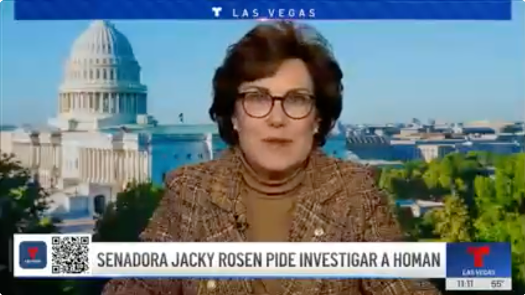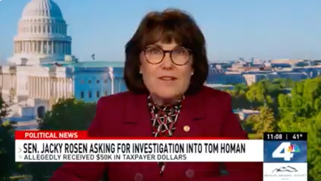 Anchor: “U.S. Senator from Nevada Jacky Rosen now calling for an investigation into Trump’s Border Czar, Tom Homan. In a letter that was sent to Deputy Inspector General William Blier. Now, Rosen says that Homan allegedly accepted $50,000 of taxpayer dollars. This was during a corruption and bribery sting operation where undercover FBI agents posed as someone seeking assistance securing government contracts. Rosen is now calling for the Justice Department to review whether Homan should be fired.”