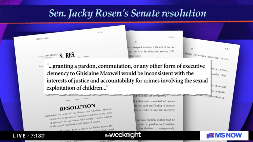 Alicia Menendez: “Democrats are trying to force Republicans on the record on this, the latest example of this is that you have Jacky Rosen, Senator Jacky Rosen, offering a Senate resolution. The language of the resolution reads, vis-à-vis Ghislaine Maxwell, “Granting a pardon, commutation, or any other form of executive clemency to Ghislaine Maxwell would be inconsistent with the interests of justice and accountability for crimes involving the sexual exploitation of children.” She’s […] stating that it’s the sense of the Senate that Trump should not grant a pardon or clemency to Maxwell. If Thune won’t bring it up for a vote she’s saying she’s going to try to force a vote by unanimous consent after February recess. You see what she’s doing here, right? She’s making sure that narratively, Republicans are being forced to answer for this, not just the release of the documents. The release of the documents is one part of this fight, but sort of this broader contextualization of whether they are standing up for the powerful or for the powerless.”