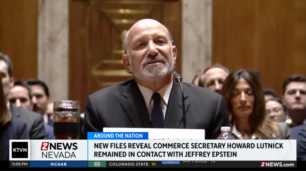 Anchor: “Lutnick previously claimed to have cut off all contact with Jeffrey Epstein after 2005 but newly released files showed the two continuing to meet – and even that Lutnick visited Epstein’s island in 2012, four years after Epstein was convicted of soliciting a minor. Lutnick claims the visit was for lunch during a family vacation with his wife, children, and their nannies. U.S. Senator for Nevada Jacky Rosen weighed in on the situation, saying, in part ‘I was appalled to see that Secretary of Commerce Howard Lutnick was included in the files, and to learn that he clearly misled the American people. I believe that to protect the trust of the American people and to uphold the honor of his office, Howard Lutnick must resign.’”