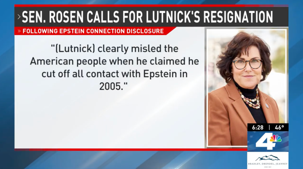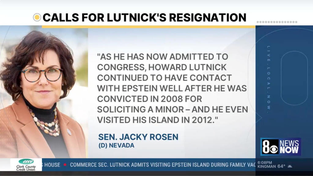 Anchor: “Nevada Senator Jacky Rosen calling for Secretary of Commerce Howard Lutnick to resign over his association with Jeffrey Epstein. Rosen saying, in part, ‘As he has now admitted to Congress, Howard Lutnick continued to have contact with Epstein well after he was convicted in 2008 for soliciting a minor, and he even visited his island in 2012. I believe that to protect the trust of the American people and uphold the honor of his office, Howard Lutnick must immediately resign as Secretary of Commerce.’”